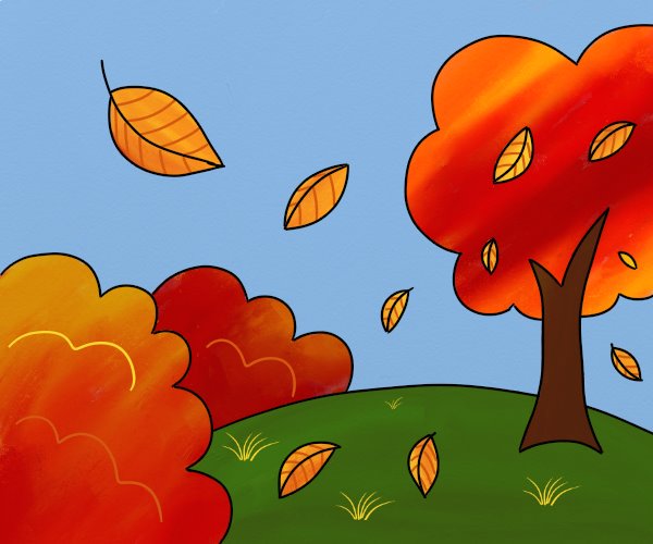 Acum vine partea cea mai distractivă – detaliile! Desenează frunze care cad din copac, împrăștiindu-le pe pagină. Frunzele mai mari pot fi aproape de tufișul din prim-plan, în timp ce frunzele mai mici le poți desena în partea de sus a paginii, aproape de coroana copacului. Încurajează-l pe copil să adauge frunzele cum dorește, pentru a reda cât mai bine atmosfera de toamnă.